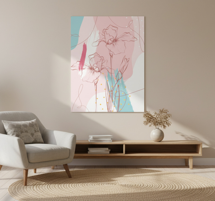 这幅艺术作品展示了精致的花卉轮廓,背景是鲜艳的粉色和水绿色。雕塑般的线条优雅地交织在一起,创造出宁静的视觉体验。金色点缀增强了构图,提供了柔和的对比。现代美学与任何现代空间和谐融合,增添了一丝优雅与宁静。