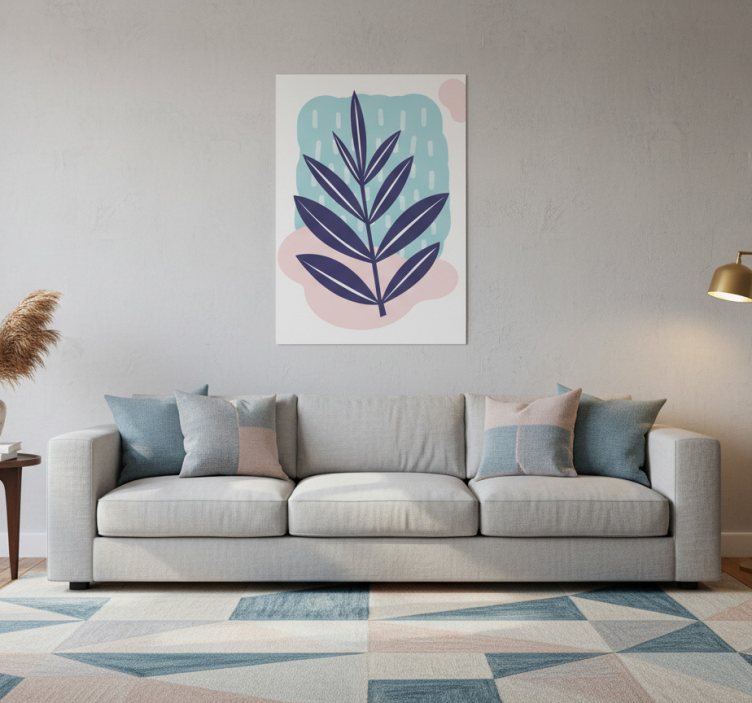 在这个现代室内场景中,一款时尚的灰色沙发上点缀着柔和色调的抱枕,完美地衬托出一幅展示风格化植物设计的生动墙面艺术作品。背景呈现出柔和的蓝色和粉色,而图案地毯则增加了质感,增强了这个温馨居住空间的舒适氛围。