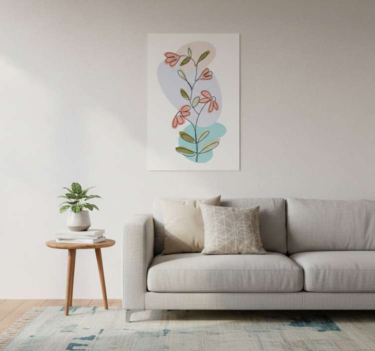 这幅艺术作品展示了一种精致的花卉设计,以粉色花朵和绿色叶子为特色。作品背景为柔和的粉彩色调,构图在自然美与现代风格之间取得了平衡。非常适合为现代居住空间增添亮色,这件作品反映了优雅与宁静,是家居装饰的迷人补充。