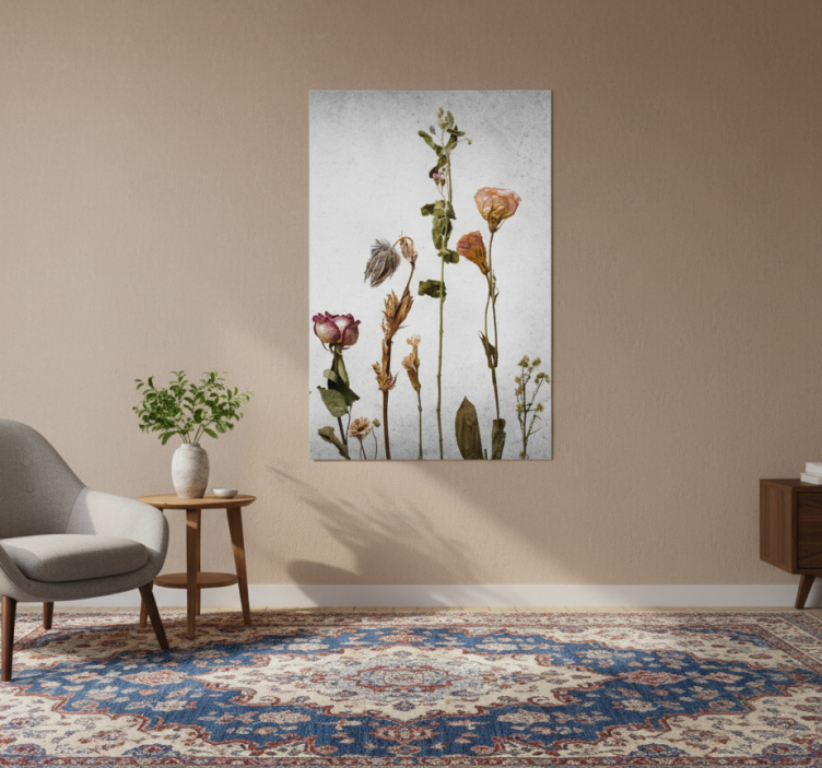 这幅图像展示了一种艺术性地排列的干花,似乎置于一个有质感的中性色背景上。各种植物元素展现出精致的细节和柔和的色调,营造出迷人的视觉效果。这种构图唤起了一种怀旧感和自然之美,非常适合提升室内装饰。