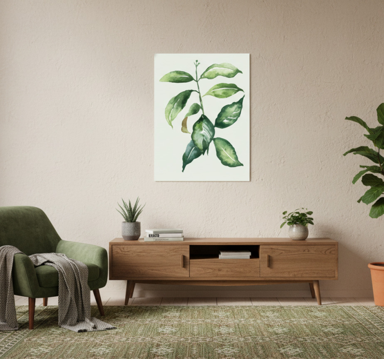 这幅图像展示了一根精美的画枝,配有鲜艳的绿色叶子。背景柔和,展现出水彩艺术的融合。这种艺术表现捕捉了自然的本质,提供了一种宁静的美感。这个设计提升了室内装饰,为任何生活空间带来清新的氛围。