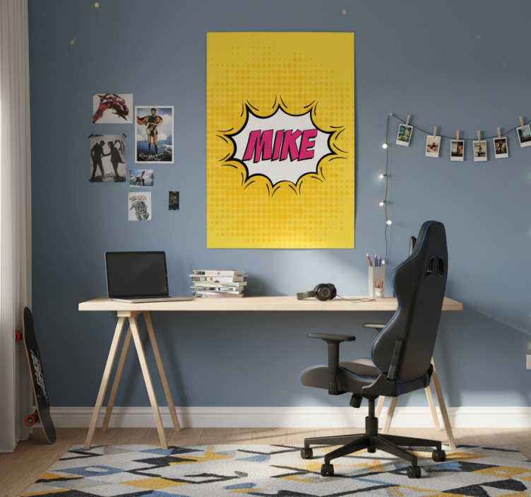 这个充满活力的工作空间展示了一张大胆的黄色海报,上面写着名字'MIKE',被一个漫画风格的爆炸图案包围。一个木制书桌配上舒适的椅子,旁边整齐地堆放着书籍。个人化的装饰包括墙上的照片和装饰灯,营造出一个温馨而富有创意的氛围。