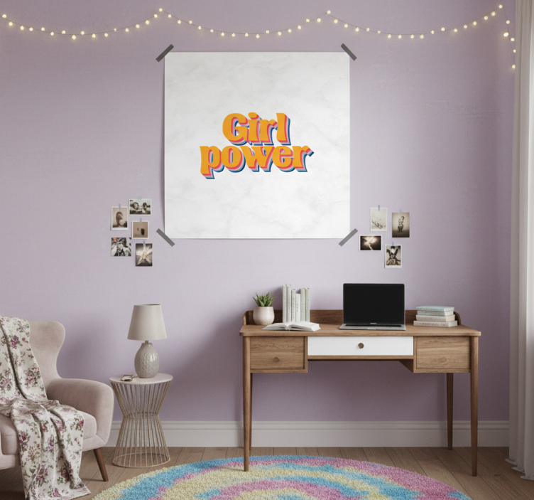 这幅图像展示了一幅激励人心的印刷品,上面用鲜艳多彩的字体写着'Girl Power'。它装饰在一个时尚的墙面上,提升了温馨工作空间的美感。一个时尚的桌子上摆放着装饰品和柔和的灯光,营造出一个适合创造力和灵感的宜人氛围。