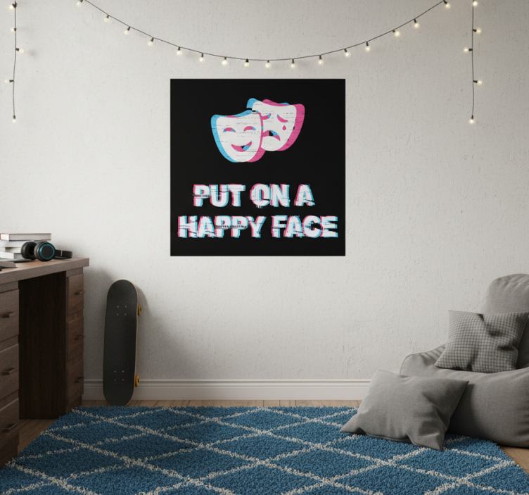这幅引人注目的图像展示了一组充满活力的戏剧面具,代表着各种情感。背景是一块纯黑色的画布,形成了鲜明的对比。显眼的文字显示为 'PUT ON A HAPPY FACE',采用了故障效果,增强了视觉冲击力,非常适合艺术或激励主题。