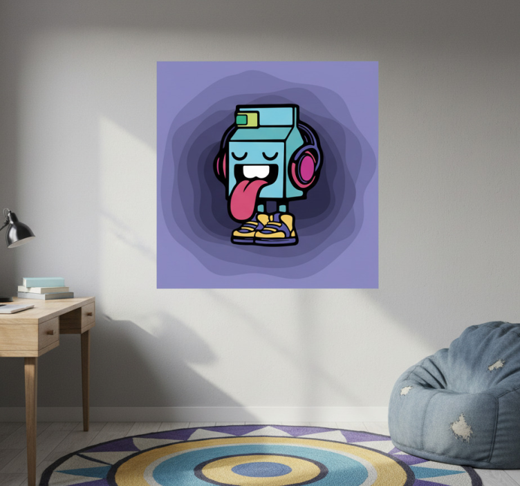 这幅图展示了一个顽皮的卡通角色,形似一个果汁盒。这个角色戴着鲜艳的耳机,露出顽皮的微笑和伸出的舌头。它自信地站在明亮的运动鞋上,背景是柔和的紫色,散发出有趣和充满活力的氛围,非常适合艺术爱好者或儿童装饰。