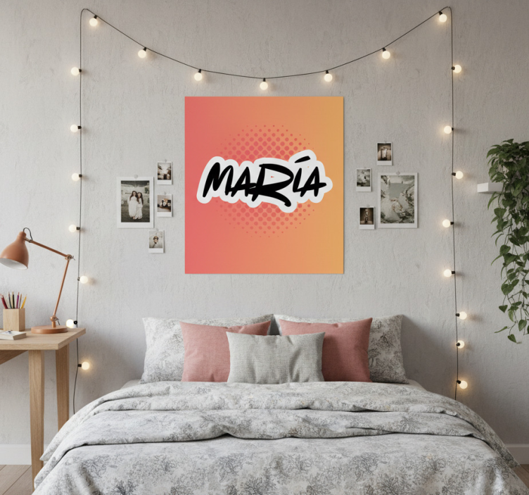 这幅图描绘了一个舒适的卧室,墙上装饰着一幅时尚的艺术作品,上面写着名字 'MARÍA'。周围是迷人的照片,增强了个性化的感觉。柔软的床上用品和温暖的灯具营造出一个宜人的氛围,非常适合放松和激发创造力。