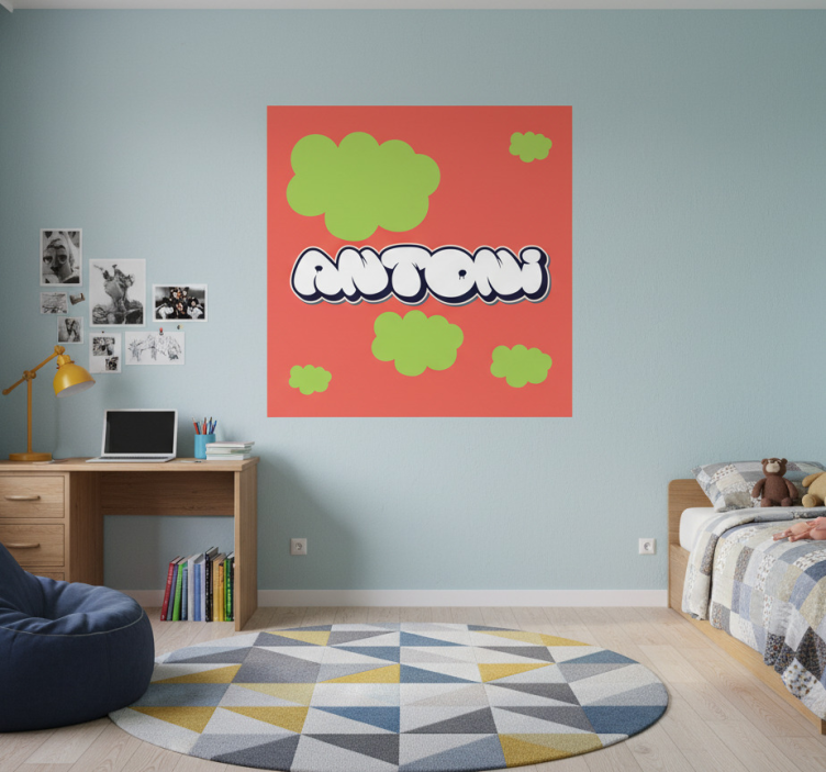 这幅生动的图像展示了一件充满活力的艺术作品,作品中以俏皮的字体呈现了名称 'ANTONI'。背景是明亮的珊瑚色,装饰着奇幻的绿色云朵形状。这个设计营造出一种充满活力和创造力的氛围,非常适合活泼的空间,将现代艺术与青春魅力完美融合。