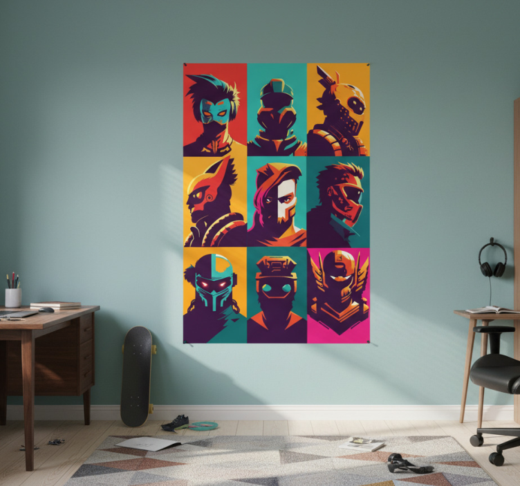 这幅充满活力的艺术作品展示了一组风格化的字符网格,每个字符都用鲜艳的颜色和大胆的对比来表现。独特的肖像展示了多样的设计,结合了未来主义和幻想的元素。对于游戏爱好者来说,这幅引人注目的壁画为任何居住空间增添了活力,强调了创造力和现代美学。