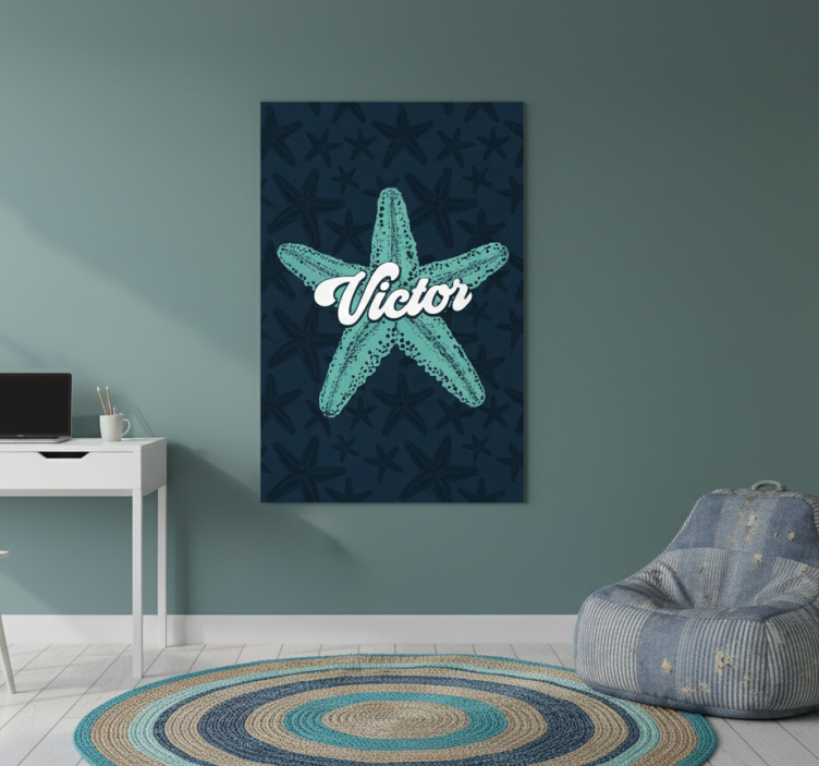 这幅生动的艺术作品展示了一只大型的青绿色海星,名字 'Victor' 用时尚的白色字体突出显示。深蓝色的背景装饰着各种海星图案,增强了水下主题。这件引人入胜的作品为任何空间增添了个性和魅力,营造出海洋的宁静感。