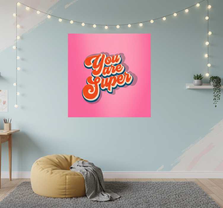 这幅艺术作品以鲜艳的粉色背景为特色,突出了充满活力的短语‘You are Super’,采用了俏皮的排版。排版结合了橙色的不同色调,并配有粗体轮廓,营造出充满活力的视觉效果。这种激励设计非常适合用于激励空间的装饰,促进积极性和创造力。