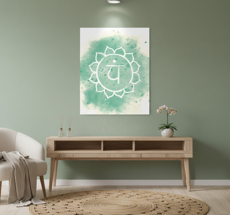 这件艺术作品展现了一个宁静的脉轮符号,周围环绕着柔和的绿色水彩效果。极简的设计增强了空间的平静氛围,而莲花花瓣的精致细节则增添了层次感。非常适合在任何室内环境中促进宁静和正念。
