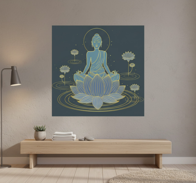 这幅艺术作品描绘了一尊宁静的佛像,坐在一朵巨大的莲花上,周围是盛开的莲花,静谧的水面上波光粼粼。柔和的光辉突显了宁静的氛围,促进了平和与正念的感觉。深色的背景与细腻的线条形成了美丽的对比,创造出和谐的构图。