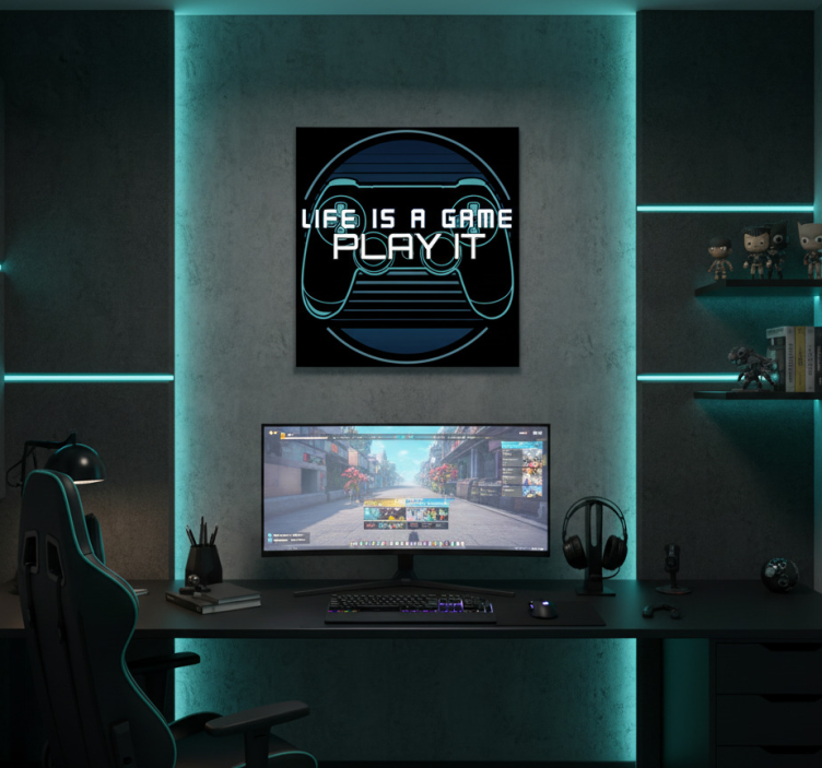 这个时尚的游戏设置拥有一张优雅的桌子,上面摆放着一台曲面显示器,展示出一个沉浸式的虚拟世界。墙上显眼地挂着一幅激励人心的艺术作品,结合了大胆的讯息和游戏手柄的设计。环境照明增强了整体现代美感,为玩家创造了一个激励人心的氛围。
