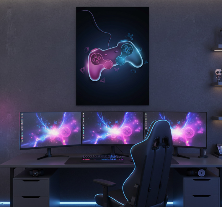 这幅数字艺术作品展示了一个充满活力的游戏控制器,散发着鲜艳的粉色和蓝色光辉。控制器位于深色背景中央,周围环绕着几何形状的游戏符号。这种构图增强了现代游戏的美学,吸引了爱好者,并创造了沉浸式的视觉体验。