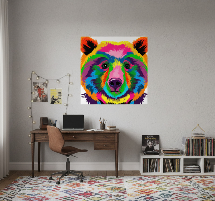 一幅生动多彩的熊肖像占据了墙面,展现出大胆的粉色、绿色和橙色。艺术作品细致地捕捉了毛发的细节,成为一个引人注目的焦点。下面的工作空间设有一个舒适的木桌,搭配一把时尚的椅子,营造出一种温馨的氛围。
