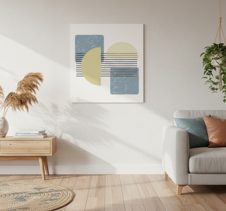 这件当代艺术作品采用了舒缓的色彩和几何形状,包括柔和的黄色和柔和的蓝色。矩形和圆形和谐地相互连接,创造出一种既俏皮又平衡的构图。细腻的线条增添了深度,提升了现代美学。非常适合为生活空间增添艺术气息。