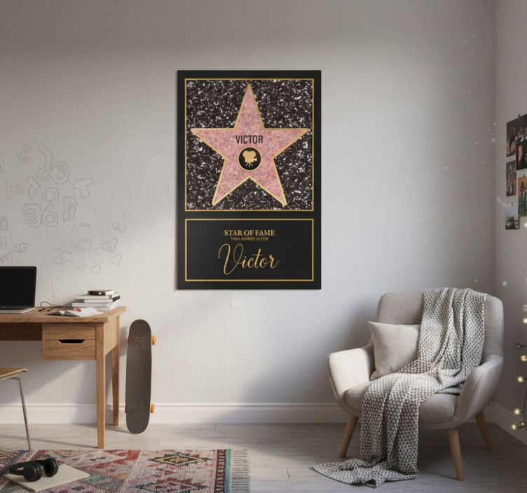 这幅图展示了一块时尚的墙壁挂牌,中央是一个粉色的星星,显著标记为 'VICTOR'。这个装饰物象征着认可,背景是带有斑点的黑色。星星下方,优雅的金色铭文写着 'STAR OF FAME',使其成为庆祝成就和里程碑的完美礼物。