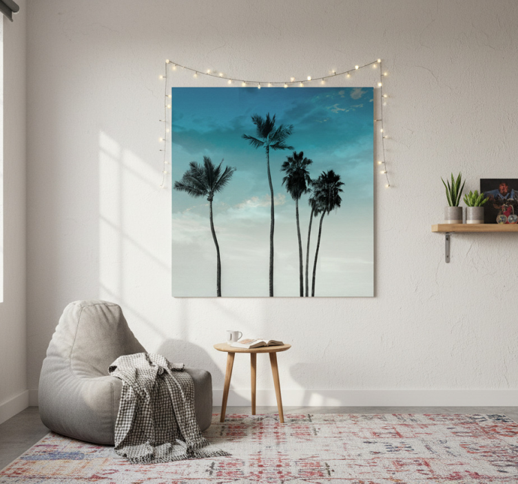 这幅图像展示了优雅的棕榈树在宁静的天空下的剪影,蓝色和浅灰色的色调交融。细腻的纹理增强了宁静的氛围,而串灯散发的柔和光线则增添了一丝温馨。这件艺术作品体现了宁静的热带氛围,非常适合提升室内空间的氛围。