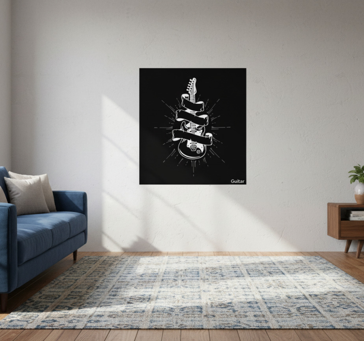 这幅引人注目的艺术作品展示了两把电吉他的风格化表现,交织着装饰性丝带。大胆的黑色背景增强了鲜明的对比,创造出动态的视觉冲击。这件作品非常适合音乐爱好者,为室内空间增添了独特的风格,激发了对吉他音乐的创造力和热情。