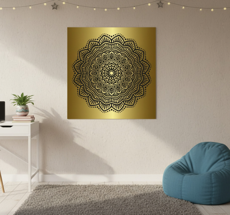 这幅引人入胜的艺术作品展示了一个优雅的黑色曼陀罗设计,背景是闪闪发光的金色。复杂的图案交织在一起,营造出美丽的对称感。现代装饰与简约的家具相得益彰,为空间增添了时尚感,非常适合提升宁静与美感。