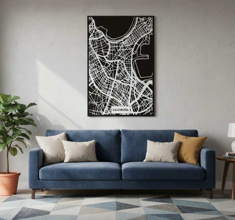 这个现代居住空间配备了一款时尚的海军蓝沙发,上面装饰着靠垫,沙发下方挂着一幅艺术风格的拉科鲁尼亚地图,背景为鲜明的黑色。一盆植物增添了绿意,而几何图案的地毯则与整体美学相得益彰,营造出一种时尚而温馨的氛围。