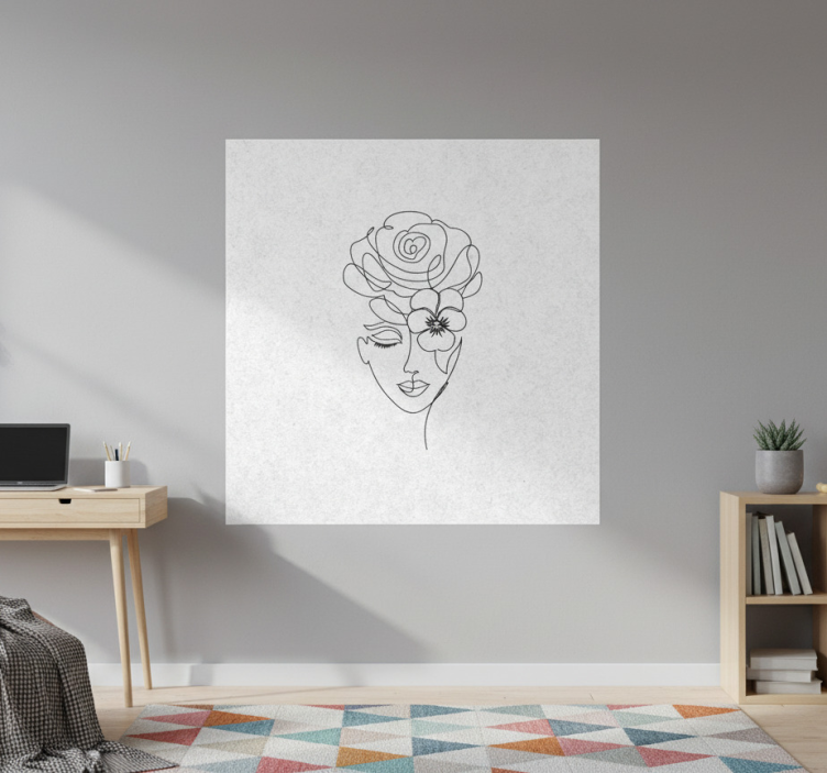 这幅艺术作品呈现了一幅简约的女性面部线条画,装饰着花朵。优雅的线条勾勒出宁静的表情,增强了美感与优雅。花卉元素无缝融合,象征着自然与女性的和谐。背景为中性色,突显了作品的细腻细节和整体美感。