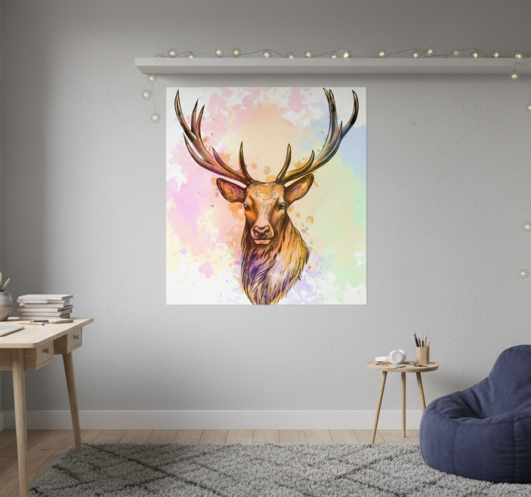 一幅壮丽的鹿头插图,雄伟的鹿角高高耸立。背景展示了色彩斑斓的水彩效果,柔和的粉彩色调交融,营造出一种空灵的氛围。这件艺术作品将现实主义与艺术风格相结合,是现代装饰或自然主题空间中引人注目的中心装饰。