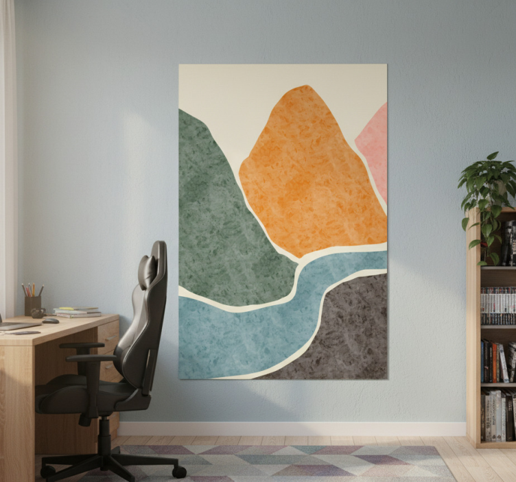 这幅艺术作品展示了抽象的山形,采用柔和、低调的色彩,如橙色、绿色和粉色。温柔蜿蜒的河流穿过风景,河流的轮廓用白色勾勒。背景呈现出浅色调,增强了宁静的氛围,使其适合现代装饰风格。