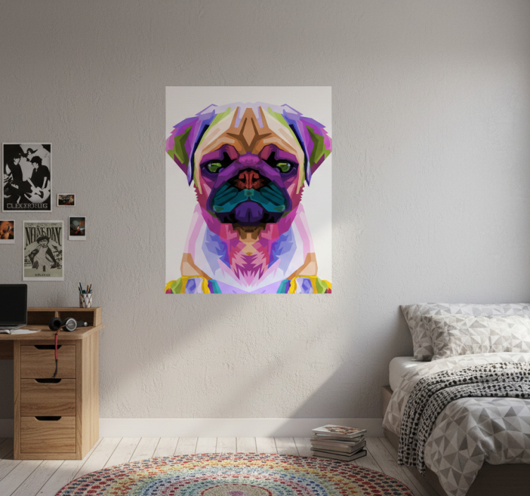 一幅生动的几何插图以一只巴哥犬为中心,主导了整个画面。这件色彩斑斓的艺术作品展示了大胆的色调和复杂的图案,突出了狗狗独特的特征。背景保持简约,使得引人注目的色彩和艺术风格更为突出,非常适合活泼现代的装饰风格。