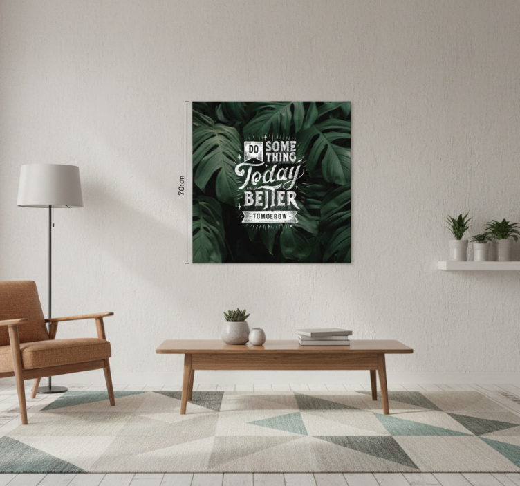 现代室内展示了一幅充满活力的墙面艺术作品,作品中间有激励人心的文字,四周环绕着郁郁葱葱的绿叶。这个短语鼓励人们今天采取积极行动,以实现更美好的明天。一把舒适的扶手椅和极简风格的装饰相得益彰,营造出一种宜人的氛围,促进灵感和宁静。