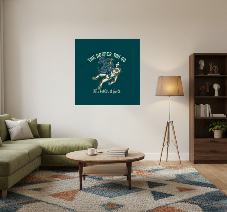 这幅生动的插图展示了一名宇航员和一个锚,传达出冒险的精神。设计背景为深青色,突显了艺术作品。文本内容为'The deeper you go, the better it feels',强调探索和享受。非常适合用于海洋或冒险主题的空间装饰。