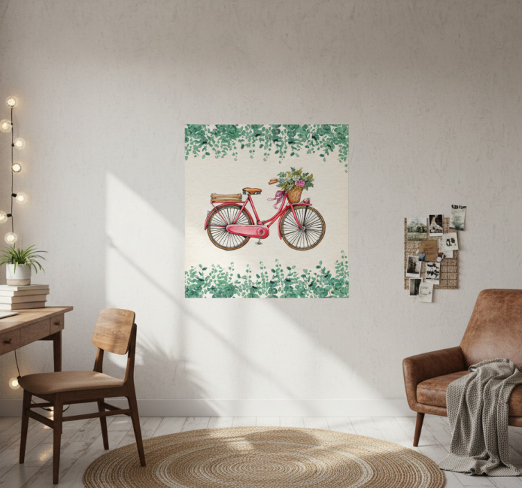 这个迷人的插图描绘了一辆复古的粉色自行车,上面装饰着一个装满鲜花的柳条篮。自行车周围环绕着细致的绿色叶子边框,营造出一种清新宜人的氛围。柔和的背景增强了自行车的怀旧魅力,使其成为任何装饰的完美选择。