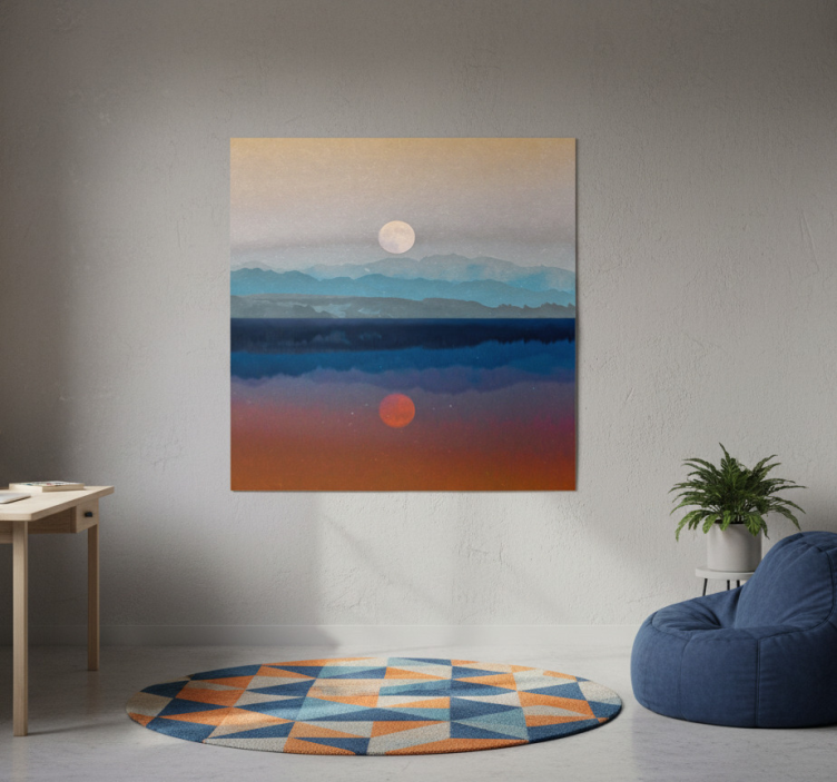 这幅艺术作品展现了一个宁静的风景,描绘了一湖平静的水面映照着安详的月亮。橙色和蓝色的色调无缝融合,营造出一种宁静的氛围。背景中的山脉轮廓增添了深度,而柔和的纹理增强了作品的舒缓特质,邀请观众沉浸在这宁静的氛围中。