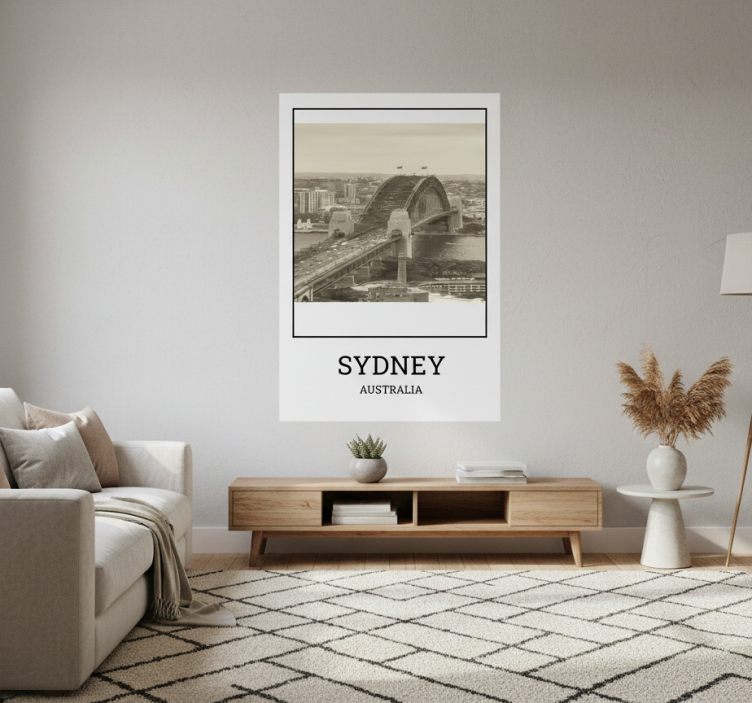 这个时尚的室内展示了一幅令人惊叹的悉尼复古海报,突出了悉尼港大桥。中性色调的装饰增强了优雅的氛围,而木质控制台和柔软的家具则营造出舒适的环境。自然元素如植物为整体设计增添了清新感。