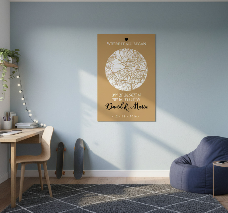 这幅艺术作品展示了一幅带有地理坐标的地图插图,象征着一个重要地点。优雅的文字上写着“David & Maria”的名字,并附有一句浪漫的话和日期,传达了一个个人故事。精致的设计提升了各种室内风格,使其成为一件完美的情感装饰品。