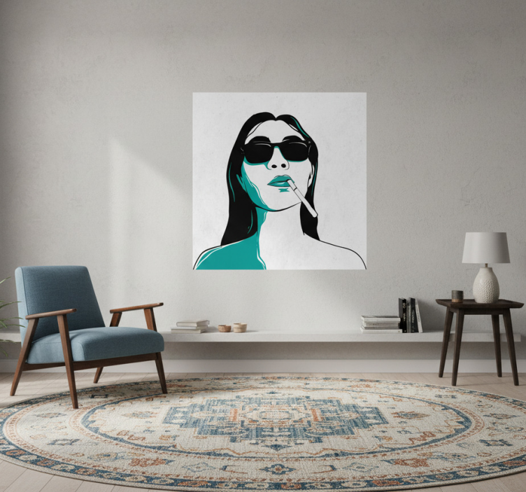 这幅引人注目的艺术作品描绘了一位长发女性,散发着自信,佩戴着时尚的太阳镜。她随意地拿着一根香烟,体现出一种态度和酷炫感。插图采用大胆的青绿色调,与中性色背景形成对比,增强了其现代美感,非常适合现代居住空间。