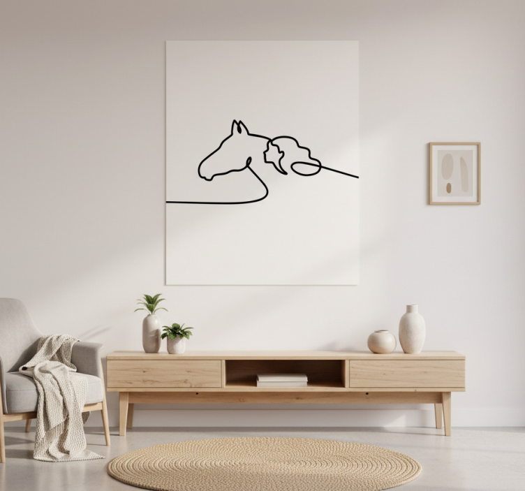 这幅图像展示了一匹马与另一种动物的简约线条画,营造出和谐的美感。背景是中性色的墙面,艺术作品提升了现代室内空间的氛围。配以自然装饰元素,整个构图反映出优雅房间的宁静与精致。