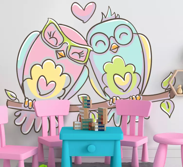 在这个充满爱与欢乐的设计中,您将看到可爱的猫头鹰和小鸟,它们成双成对,展现出浓厚的爱情氛围。粉色与蓝色的搭配,使整个插图散发出一种快乐而温馨的感觉,完美适合任何想要提升家居氛围的地方。这款动物贴画可爱的爱情鸟将为您的空间增添一抹生机与活力!