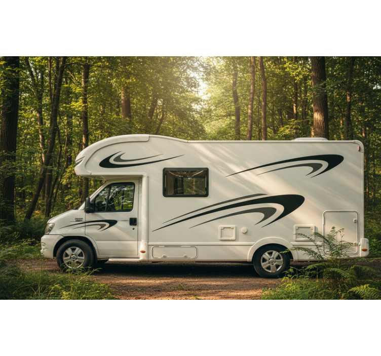 一辆现代休闲车停在宁静的森林环境中,四周环绕着郁郁葱葱的绿意。流线型的设计展现出动态的线条,唤起运动和冒险的感觉,非常适合渴望开放道路的人们。这种美学暗示着自由与探索,使其成为户外爱好者的理想选择。