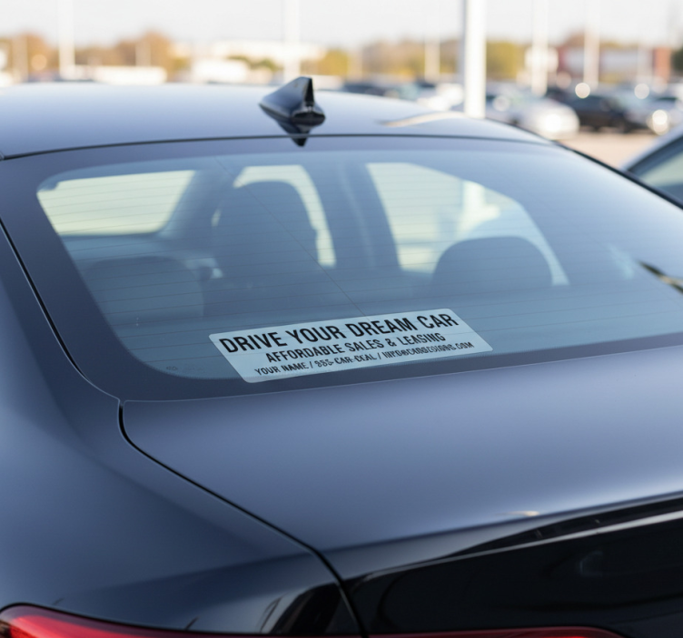 一辆汽车的后窗展示了一种促销设计,强调了经济实惠的汽车销售和租赁服务。短语 'DRIVE YOUR DREAM CAR' 传达了一种鼓舞人心的信息,鼓励潜在客户追求他们理想的汽车体验,同时突显了获取专业服务的便利性。