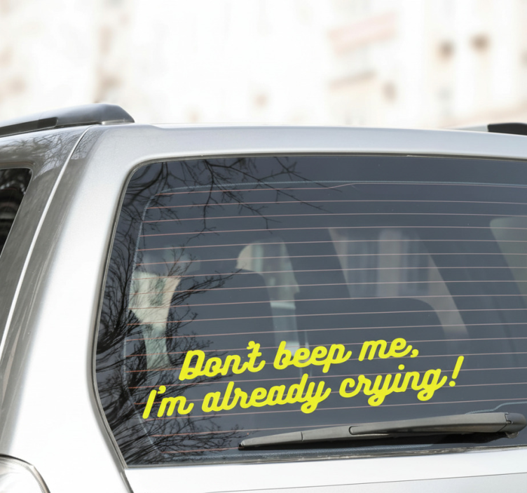 一款幽默的设计出现在车辆后窗上,传达了一种轻松的情感。短语 "Don't beep me, I'm already crying!" 暗示了一个令人不堪重负或沮丧的时刻,邀请其他司机产生共鸣,增强了车辆的个性。
