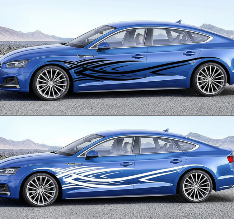 这幅图像展示了一辆流线型的车辆,装饰着大胆的曲线图形,增强了其动感外观。流畅的线条营造出运动感,非常适合那些希望个性化自己座驾的人。这种设计表达了个性和风格,在道路上形成了强烈的视觉冲击。