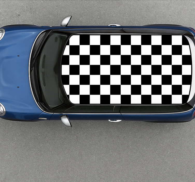 这幅图像展示了一辆车,其车顶上有着引人注目的棋盘格图案。这种设计让人联想到赛车的美学,为车辆增添了运动感,轻松吸引了注意力。它体现了速度与兴奋的感觉,适合任何赛车运动爱好者。