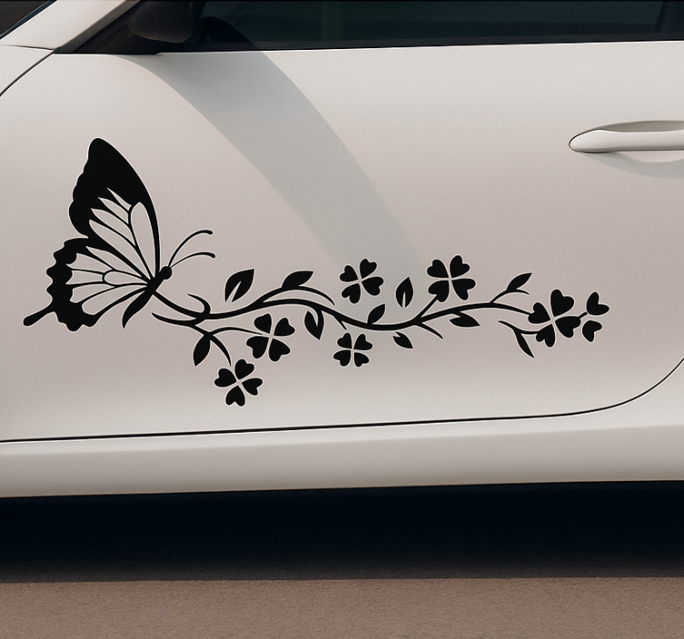 一个精致的设计展示了一只优雅地栖息在盛开藤蔓上的蝴蝶。这个复杂的图案象征着转变与美丽,唤起自然优雅的感觉。适合提升汽车的美感,为日常生活增添一丝艺术气息。