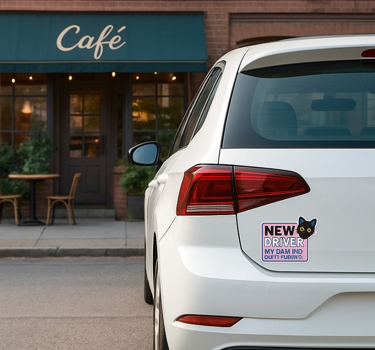 一辆车展示了生动的设计,表明这是一个新司机,配有可爱的猫咪插图。这种俏皮的表现方式保持了轻松的语气,短语'MY DRIVING SCARES ME TOO' 幽默地捕捉了许多新司机所感受到的紧张。色彩和图像的结合吸引了注意力,并在路上提供了一个友好的提醒。