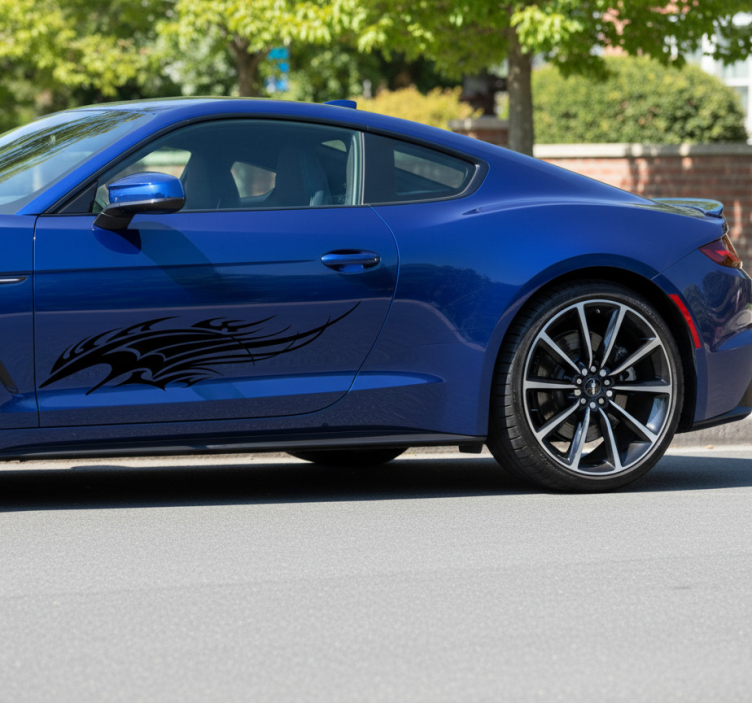一辆流线型的车辆侧面装饰着精美的图案,增强了其运动感。设计由动态流畅的线条构成,暗示着运动和速度,为汽车的外观增添了攻击性。这样的设计通常象征着力量和个性,吸引着汽车爱好者。