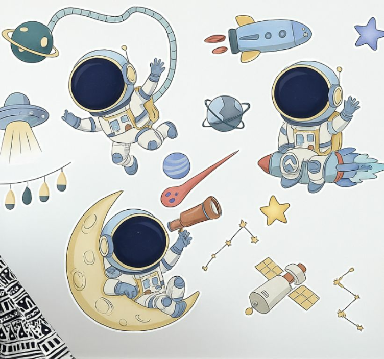 在这个充满奇幻色彩的宇宙场景中,冒险等待着我们,顽皮的宇航员们正与火箭、行星和流星等太空探索元素互动。这个设计体现了与太空旅行相关的发现和好奇的精神,邀请人们的想象力超越地球的界限。