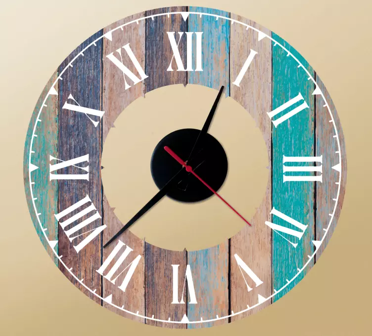 參考:: A49324这个设计展示了一个迷人的时钟表盘,周围环绕着一系列罗马数字,呈现出圆形的木纹效果。色彩和纹理的结合增添了一种乡村风格,使其成为任何居住空间的优雅补充。