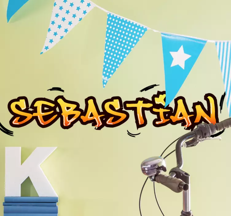 一个充满活力的设计,特色是用充满活力的字体定制的名字,周围环绕着欢快的生日装饰。生动的颜色和风格使其非常适合为儿童空间增添个人风格,庆祝个性和创造力。