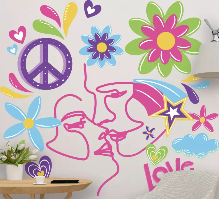 參考:: A48089一个充满活力的作品,展示了交织的面孔、五彩缤纷的花朵和心形图案,象征着爱与和平。这种生动的排列散发出一种俏皮的气息,使其成为个人空间的迷人补充,营造出温暖而宜人的氛围。
